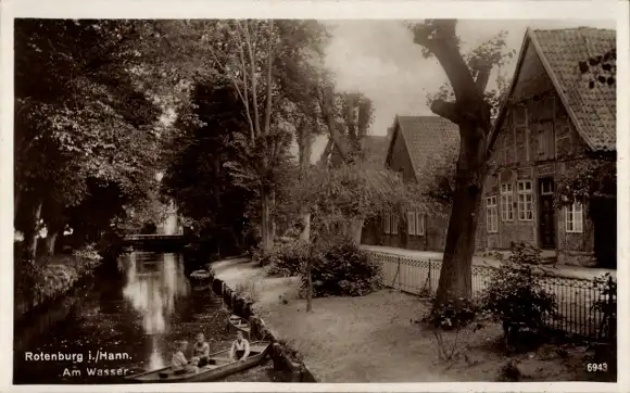 Ak Rotenburg an der Wümme, Partie am Wasser, Boot, Kinder, Fachwerkhäuser
