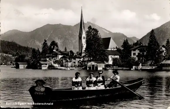 Ak Rottach Egern in Oberbayern, Bodenschneid, Frauen und Mann in Tracht, Boot, Kirche