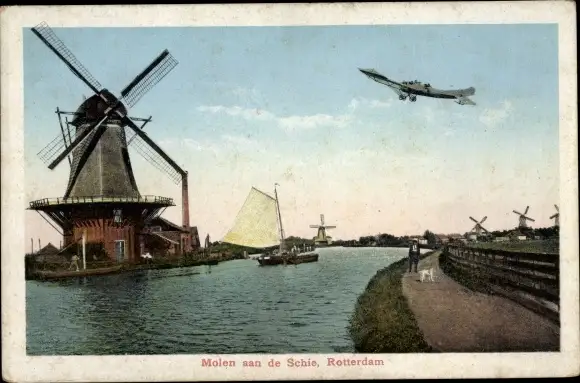 Ak Rotterdam Südholland Niederlande, Molen aan de Schie, Flugzeug, Segelboot