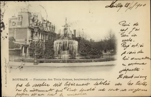 Ak Roubaix Nord, Le Musee, Fontaine des Trois Graces, boulevard Gambetta