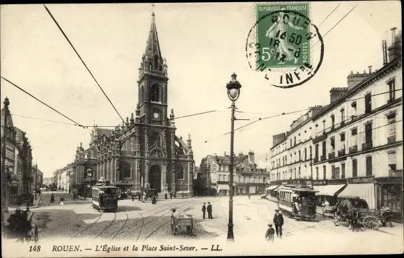 Ak Rouen Seine Maritime, Kirche, La Place Saint-Sever, Straßenbahn