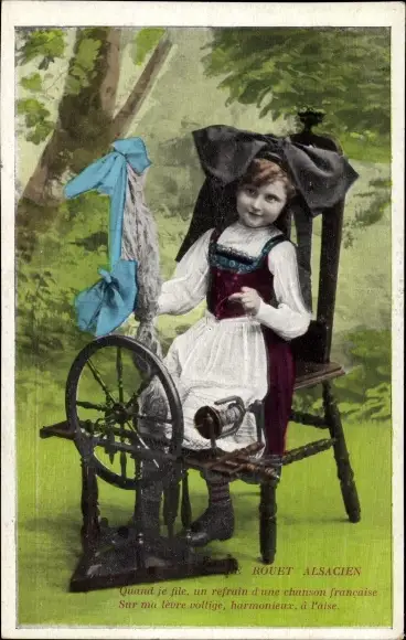Ak Rouet Alsacien, Portrait eines Mädchens in Elsässer Tracht, Spinnrad