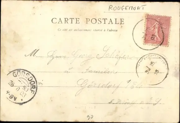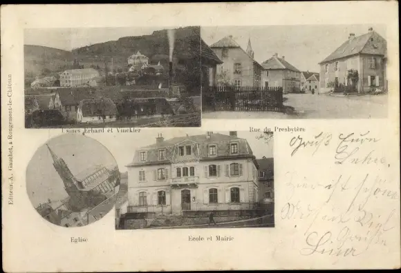 Ak Rougemont le Château Territoire de Belfort, Usines Erbard et Vinekler, Eglise, Ecole et Mairie