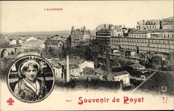 Ak Royat Puy de Dôme, Vue générale, Frau in Volkstracht