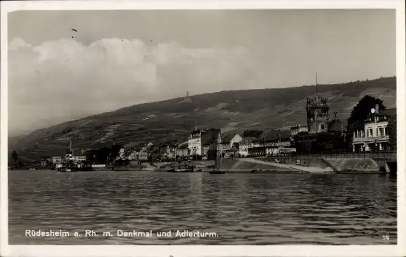 Ak Rüdesheim am Rhein, Denkmal, Adlerturm, Flusslandschaft, Boote, Uferfront