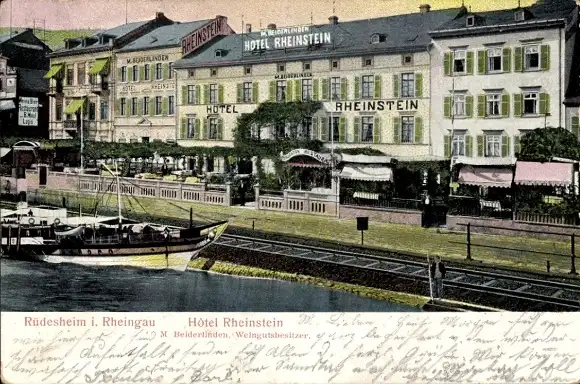 Ak Rüdesheim am Rhein, Hotel Rheinstein, M. Beiderlinden, Dampfer