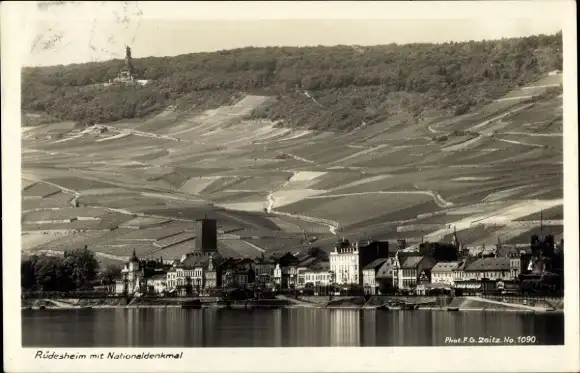 Ak Rüdesheim am Rhein, Rüdesheim mit Nationaldenkmal, Weinberge, Rheinblick