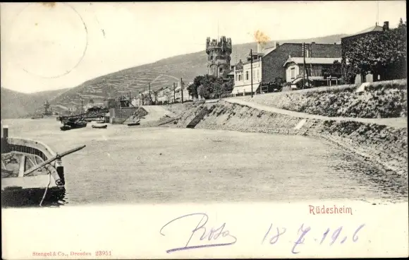 Ak Rüdesheim am Rhein, Schiff, Turm, Ufer