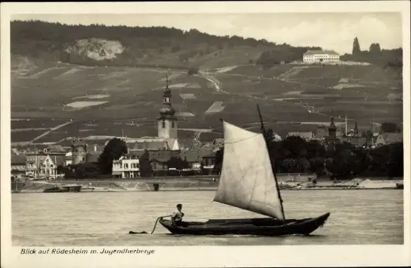 Ak Rüdesheim am Rhein, Teilansicht, Jugendherberge, Boot