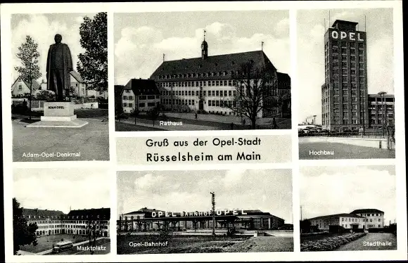 Ak Rüsselsheim Main, Adam Opel Denkmal, Rathaus, Bahnhof