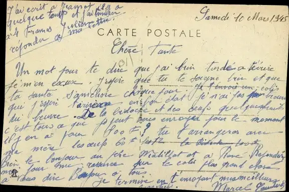 ungelaufen, datiert 1945, Rückseite beschrieben, beschnitten, sonst guter Zustand