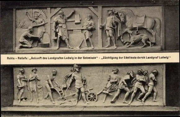 Ak Ruhla in Thüringen, Reliefs, Ankunft Landgraf Ludwig in der Schmiede, Züchtigung der Edelleute