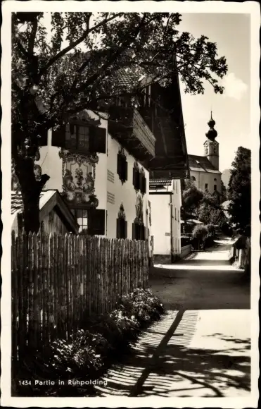 Ak Ruhpolding in Oberbayern, Straßenpartie, Kirche