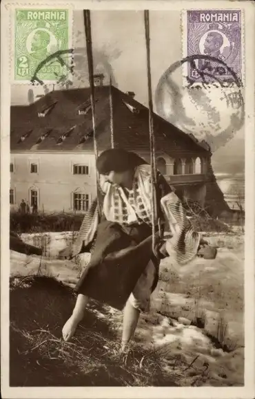 Ak Rumänien, Frau in Trachtt auf einer Schaukel