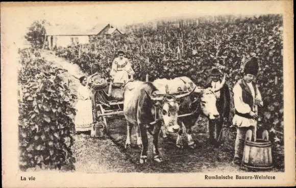 Ak Rumänien, Rumänische Bauern bei der Weinlese, Rinderkarren