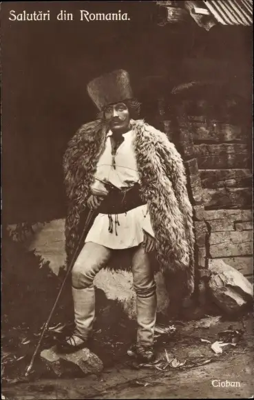 Ak Rumänischer Bauer, Gehstock, Pelz