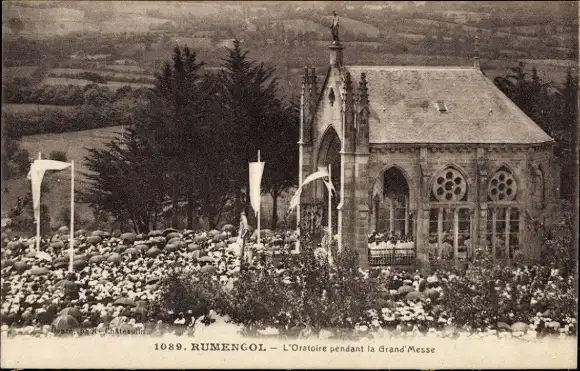 Ak Rumengol Finistère, Oratorium während der großen Messe, Schäfherde, Kirche, ländliche Umgebung
