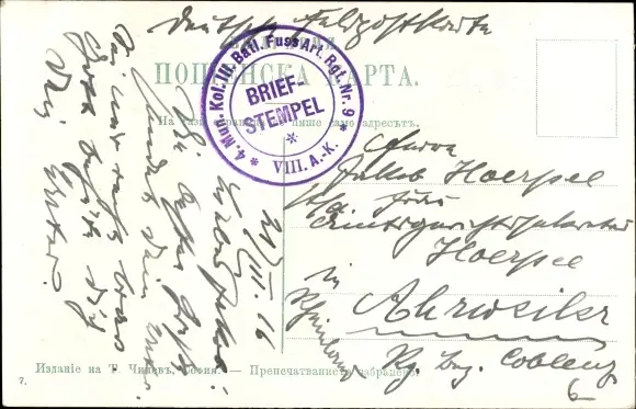 gelaufen als Feldpost 1916, 4. Mun Kol III. Batl Fuß Artl Regt Nr 9 VIII. A.K., Ecken bestoßen, sonst guter Zustand