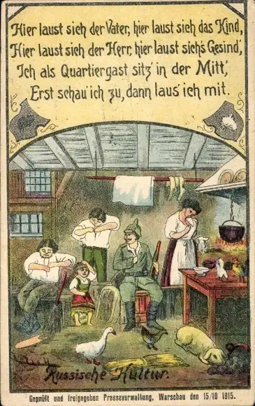 Ak Russische Kultur, Deutscher Soldat in einer russischen Bauernstube, I. WK