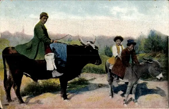 Ak Russische Typen aus Zentral-Asien, Rind, Esel