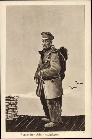 Ak Russischer Schornsteinfeger auf einem Hausdach