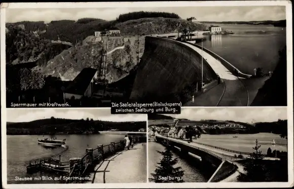 Ak Saalburg Ebersdorf in Thüringen, Sperrmauer mit Kraftwerk, Stausee, Teilansicht der Stadt