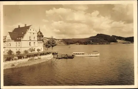 Ak Saalburg in Thüringen, HO Gaststätte Kranich, Boot, Saaletalsperre
