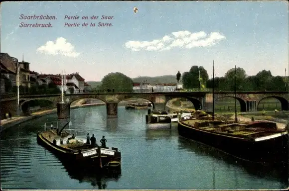 Ak Saarbrücken a.d. Saar, Saar mit Frachtern und Brücke