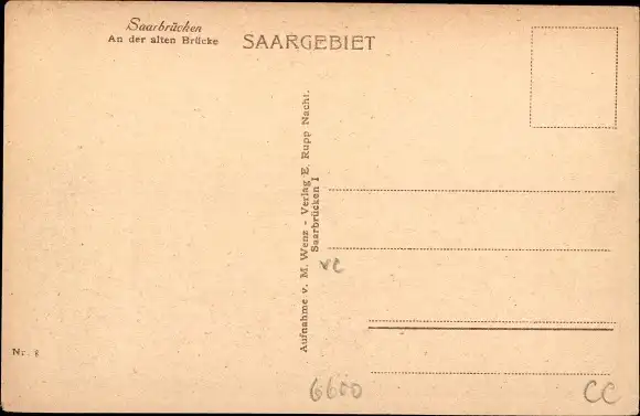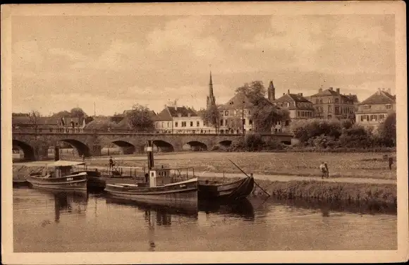Ak Saarbrücken im Saarland, An der alten Brücke, kleinere Schiffe, Teilansicht der Stadt