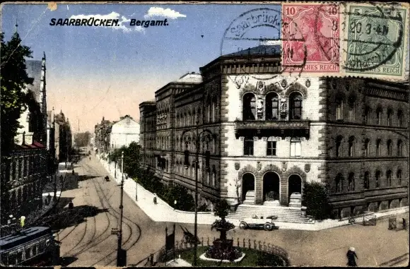 Ak Saarbrücken im Saarland, Bergamt, Außenansicht, Straßenbahn
