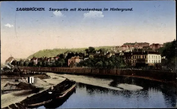 Ak Saarbrücken im Saarland, Saarpartie mit Krankenhaus im Hintergrund