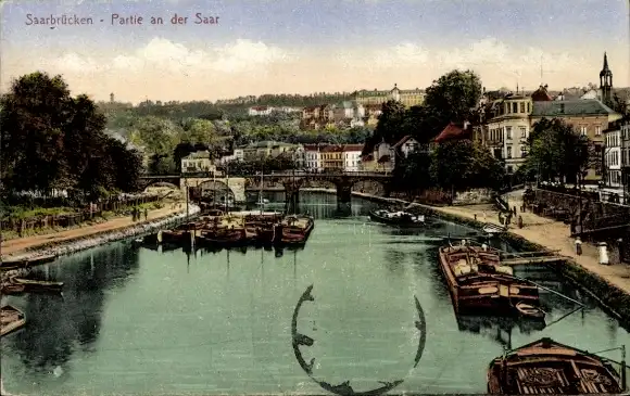Ak Saarbrücken im Saarland, Saarufer, Boote, Brücke