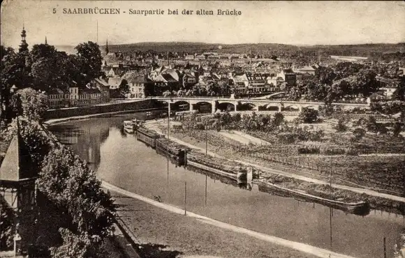 Ak Saarbrücken im Saarland, Totalansicht, Saarpartie, alte Brücke