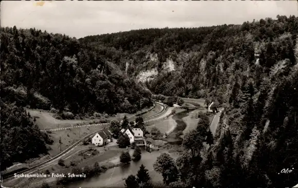 Ak Sachsenmühle Gößweinstein in Oberfranken, Ortsansicht, Tal, Wald