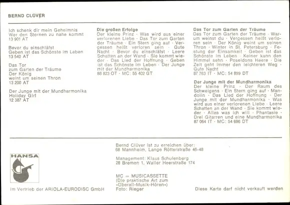 Ak Sänger Bernd Clover, Portrait, Autogramm