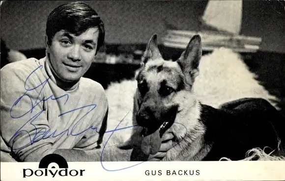 Ak Sänger Gus Backus mit Schäferhund, Polydor Schallplatten, Autogramm