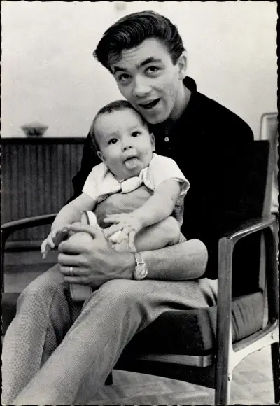 Ak Sänger Gus Backus posiert mit Baby, Portrait