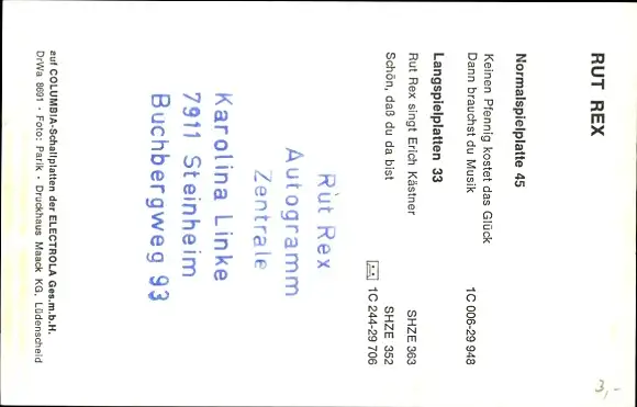 Ak Sängerin Rut Rex, Portrait, Autogramm