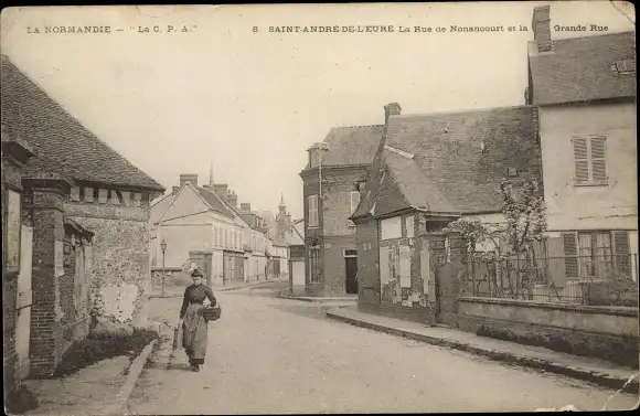 Ak Saint André de l'Eure Eure, Rue de Nonancourt et Grande Rue, Femme avec panier
