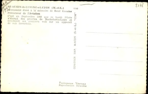 Ak Saint Aubin de Luigné Maine et Loire, Monument eleve a la memoire de Rene Gasnier