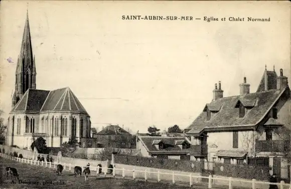 Ak Saint Aubin sur Mer Calvados, Kirche, normannisches Chalet