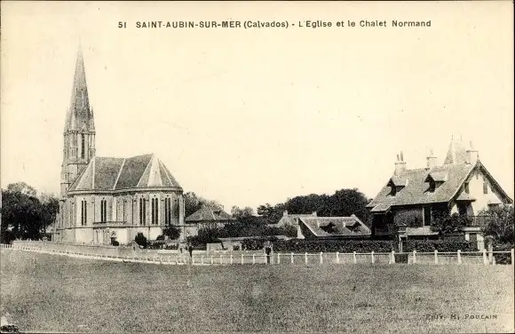 Ak Saint Aubin sur Mer Calvados, L'Eglise, Chalet Normand.