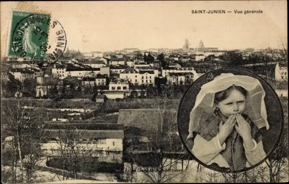 Ak Saint Junien Haute Vienne, vue generale, Ortsansicht, Portrait Mädchen in Tracht