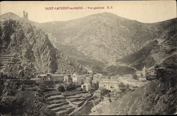 Ak Saint Laurent les Bains Ardèche, Vue générale, Blick auf den Ort, Ruine