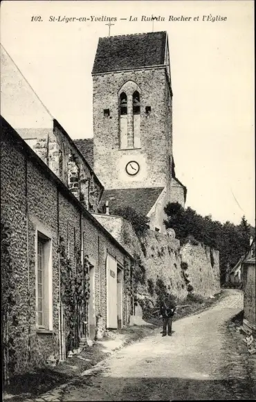 Ak Saint Leger en Yvelines, La Rue du Rocher et l'Eglise