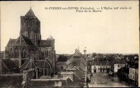 Ak Saint-Pierre-sur-Dives Calvados, Église et Place de la Mairie