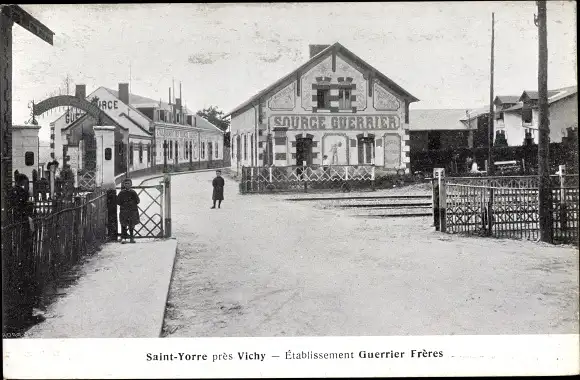 Ak Saint Yorre Allier, Établissement Guerrier Frères, Straßenpartie, Bahnübergang