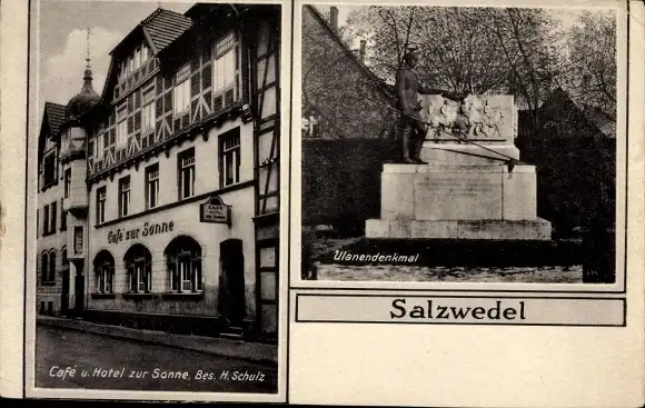 Ak Salzwedel in der Altmark, Café-Hotel zur Sonne, Ulanendenkmal