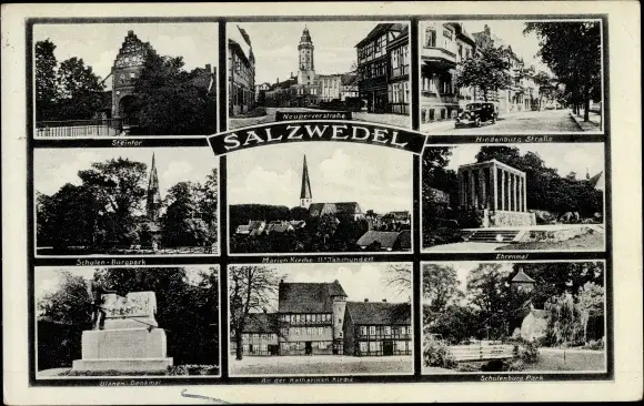 Ak Salzwedel in der Altmark, Steintor, Ehrenmal, Katharinenkirche, Schulenburgpark, Marienkirche