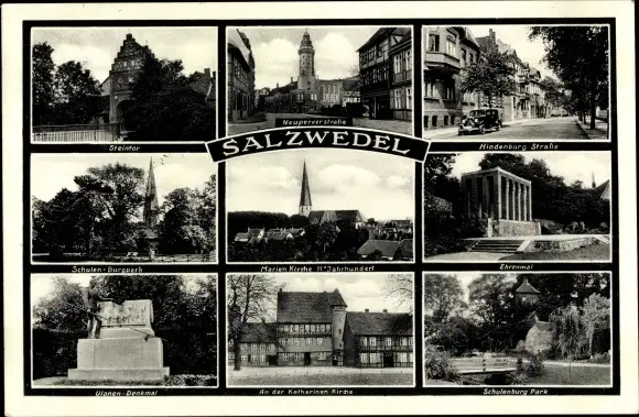 Ak Salzwedel in der Altmark, Steintor, Marienkirche, Ehrenmal, Schulenburg Park